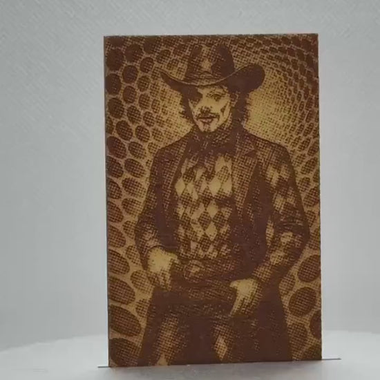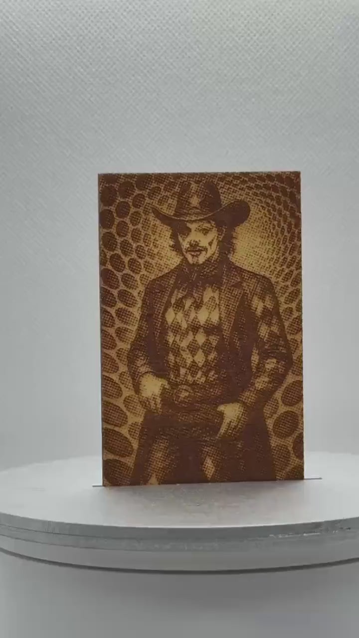 This 2”×3” birch wood magnet features a harlequin-style cowboy with a smile that’s 50% charm, 50% “don’t turn your back.”